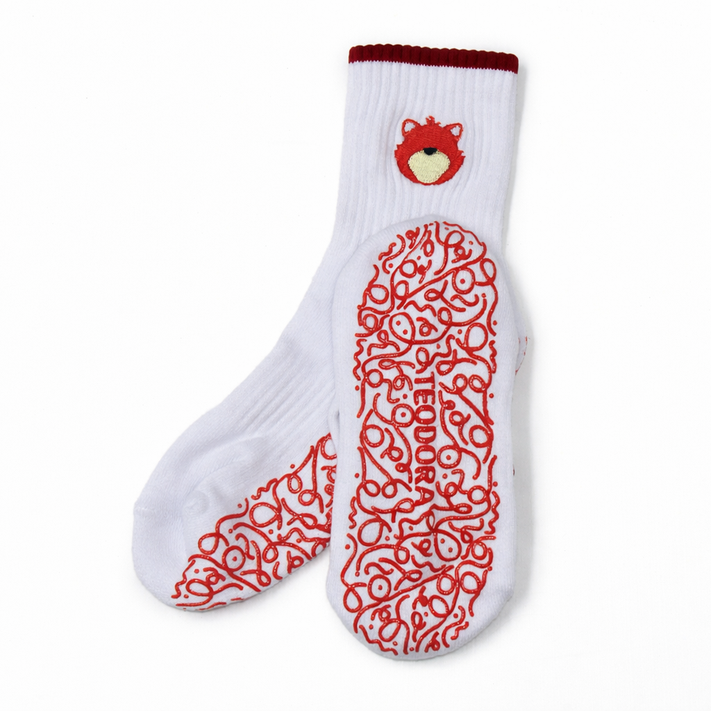 One-size-fits-all Pilates socks made from 85% combed cotton, 12% polyester, and 3% spandex.